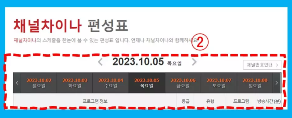 - ②번 페이지가 열립니다. 여기서 편성표를 보실 수 있습니다.