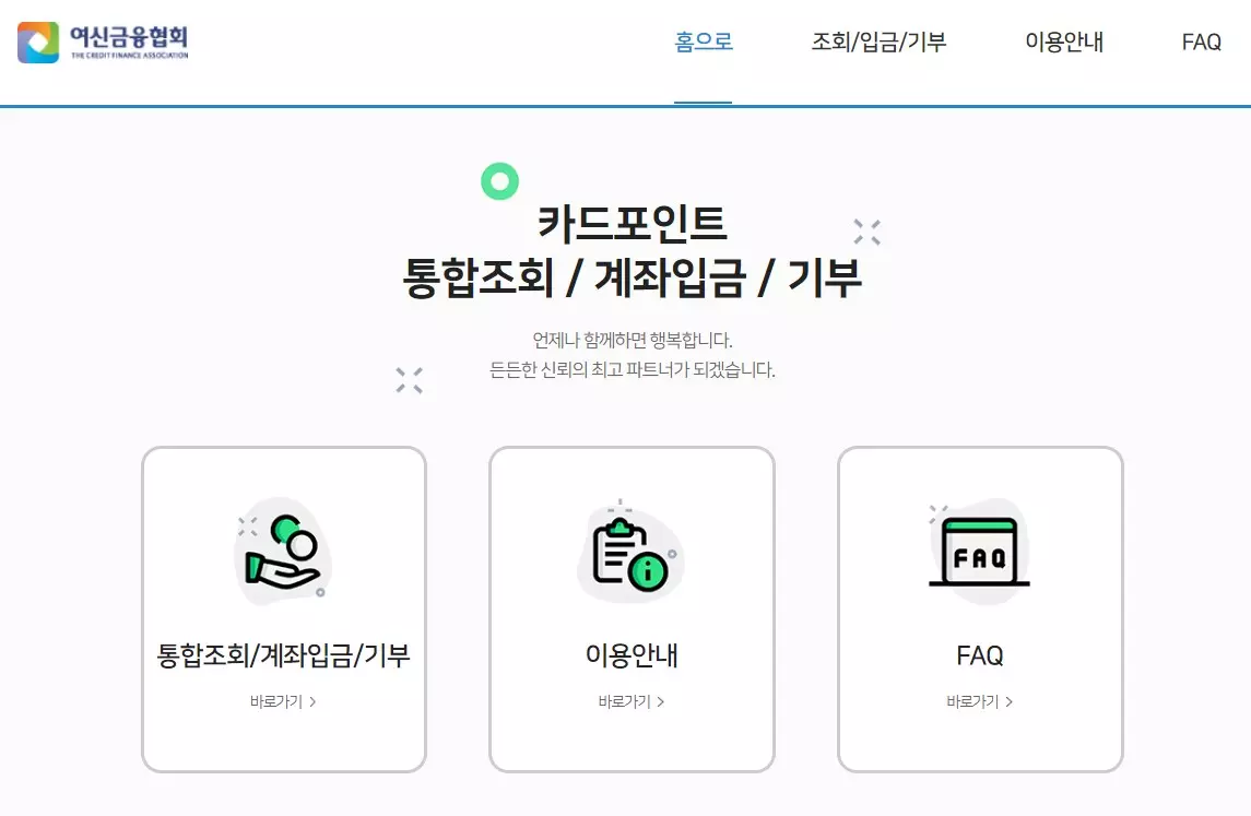 카드포인트통합조회 / 계좌입금 / 기부 언제나 함께하면 행복합니다. 든든한 신뢰의 최고 파트너가 되겠습니다.