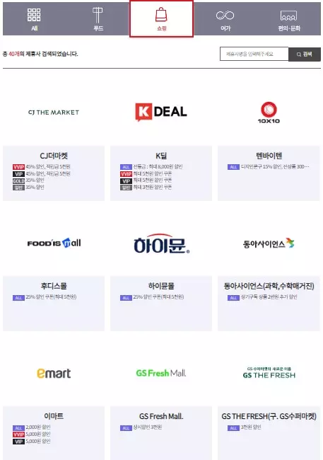 푸드, 쇼핑, 여가, 편의/문화 등 다양하게 있으니 쏠쏠하게 이용하실 수 있답니다. 아래에 쭉 나열되어 있으니 이걸 보셔도 되지만 가능한 검색을 해보시는 걸 추천합니다.