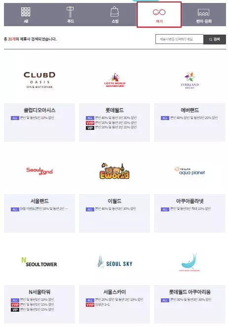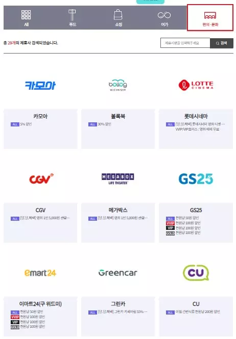 푸드, 쇼핑, 여가, 편의/문화 등 다양하게 있으니 쏠쏠하게 이용하실 수 있답니다. 아래에 쭉 나열되어 있으니 이걸 보셔도 되지만 가능한 검색을 해보시는 걸 추천합니다.