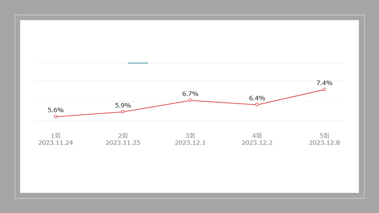 5회에는 7%선을 돌파해 7.4%의 고공 시청률을 보였다.