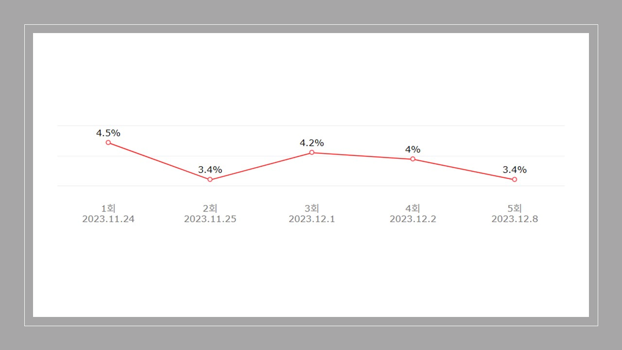 | 4회 | 6.4% | 종합 5위, 드라마 3위 | 4.0% | 종합 20위, 드라마 4위 |