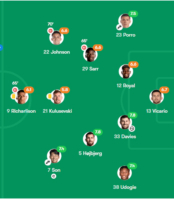손흥민은 통계사이트 풋몹에서 7.4점으로 팀 내 세 번째, 공격진 중에서 첫 번째로 높은 평가를 받았다.