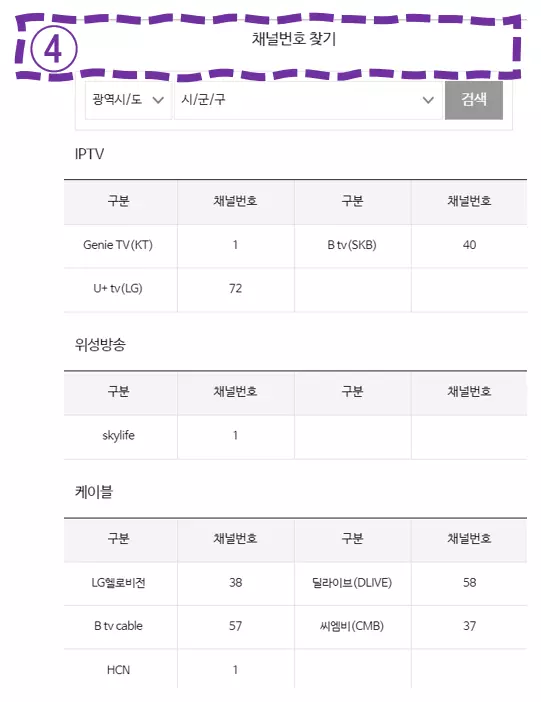④번 화면대로 채널번호 찾기를 하실 수 있어요.