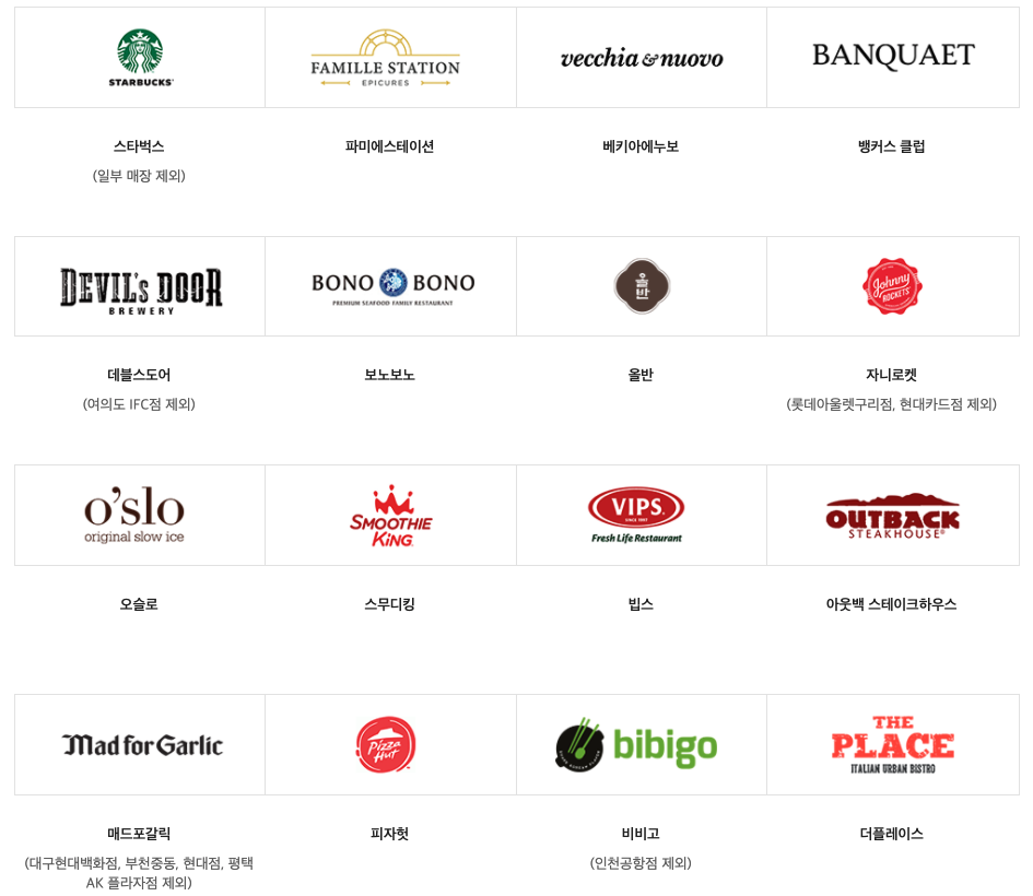 스타벅스 (일부 매장 제외). 파미에스테이션, 베키아에누보, 뱅커스 클럽, 데블스도어 (여의도 IFC점 제외), 보노보노, 올반, 자니로켓 (롯데아울렛 구리점, 현대카드점 제외), 오슬로, 스무디킹, 빕스, 아웃백 스테이크하우스, 매디포갈릭 (대구현대백화점, 부천중동, 현대점, 평택 AK 플라자점 제외), 피자헛, 비비고 (인천공항점 제외), 더플레이스, 아워홈, 불고기 브라더스, OLA 채빛 퀴진
