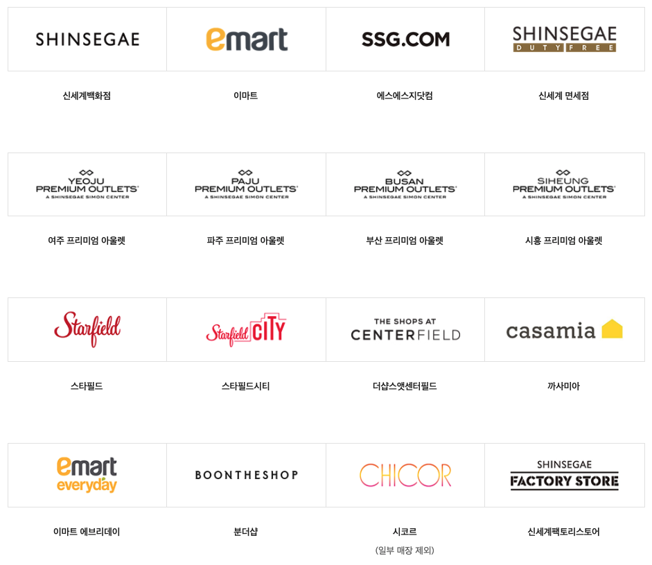 스타필드, 스타필드 시티, 더샵스앳센터필드, 까사미아, 이마트 에브리데이, 분더샵, 시코르(일부 매장 제외), 신세계 팩토리 스토어, 노브랜드(일부 매장 제외), 일렉트로마트, 몰리스펫샵, JAJU 전문점, 와인앤모어, 제일모직,