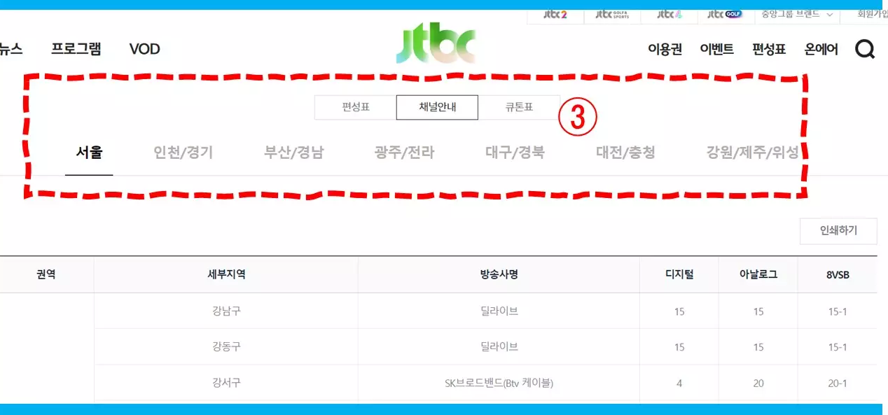 - ②번 편성표에서 JTBC의 원하는 채널을 선택하세요.
