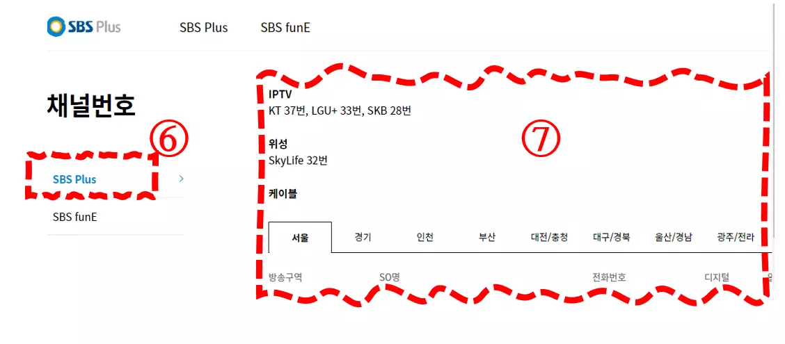 ⑦ 여기서 지역별 채널번호를 확인하시고 싶으시면 이 화면의 아랫부분에서 확인하실 수 있어요.